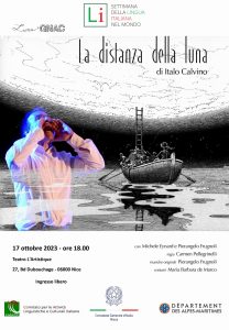 Nel quadro della XXIII edizione della Settimana della Lingua Italiana nel Mondo (16-22 ottobre 2023), il Consolato Generale d’Italia a Nizza è lieto di presentare, insieme al Comitato per le Attività Linguistiche e Culturali Italiane (Co.A.L.C.It.) e al Dipartimento delle Alpi Marittime – lo spettacolo teatrale con musica dal vivo “La distanza della Luna”. La pièce – tratta da “Le cosmicomiche” di Italo Calvino, del quale quest’anno ricorre il centenario della nascita – andrà in scena alle ore 18:00 del 17 ottobre prossimo presso il teatro “L’Artistique” (boulevard Dubouchage, 27 – 06000 Nizza). L’ingresso è libero.